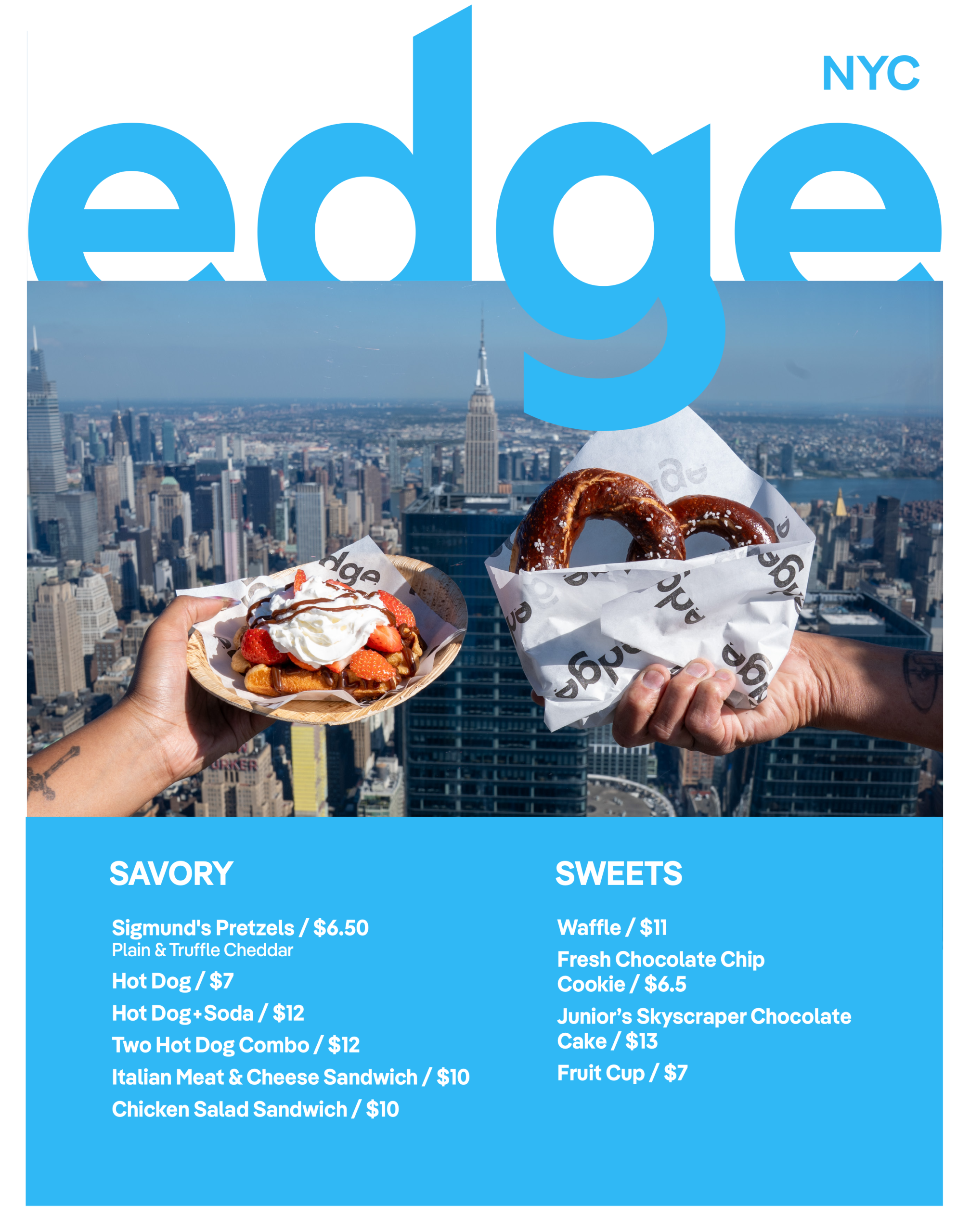 Explore our selection of tasty dishes and drinks, perfect for enhancing your visit at Edge.